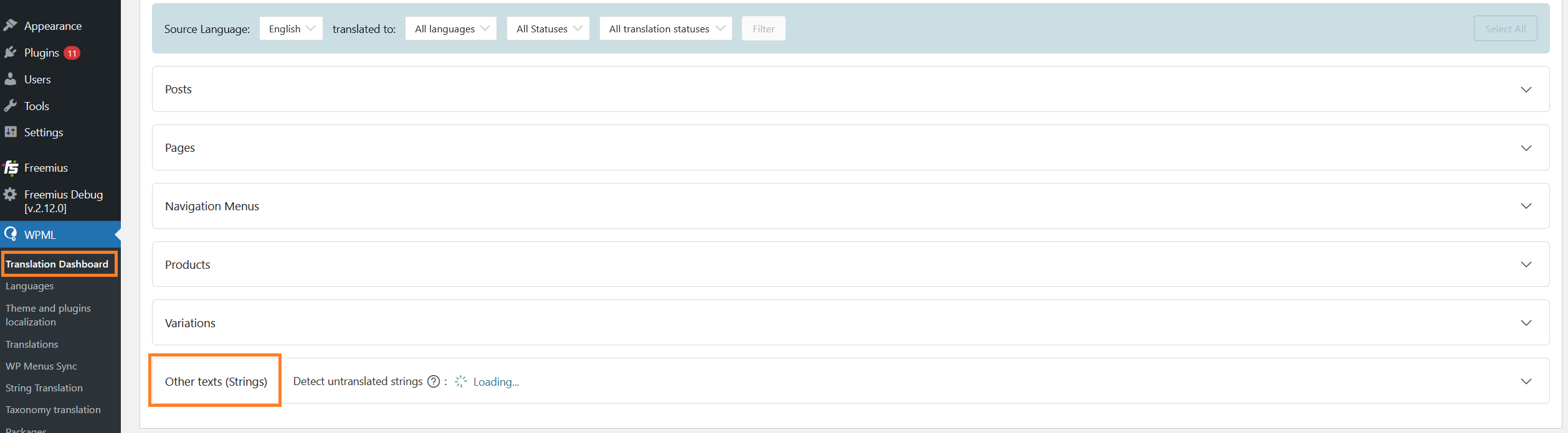 The assigned translator will see the strings to be translated under WPML > Translations. You can also review the progress of the translation by going to WPML > String Translation.