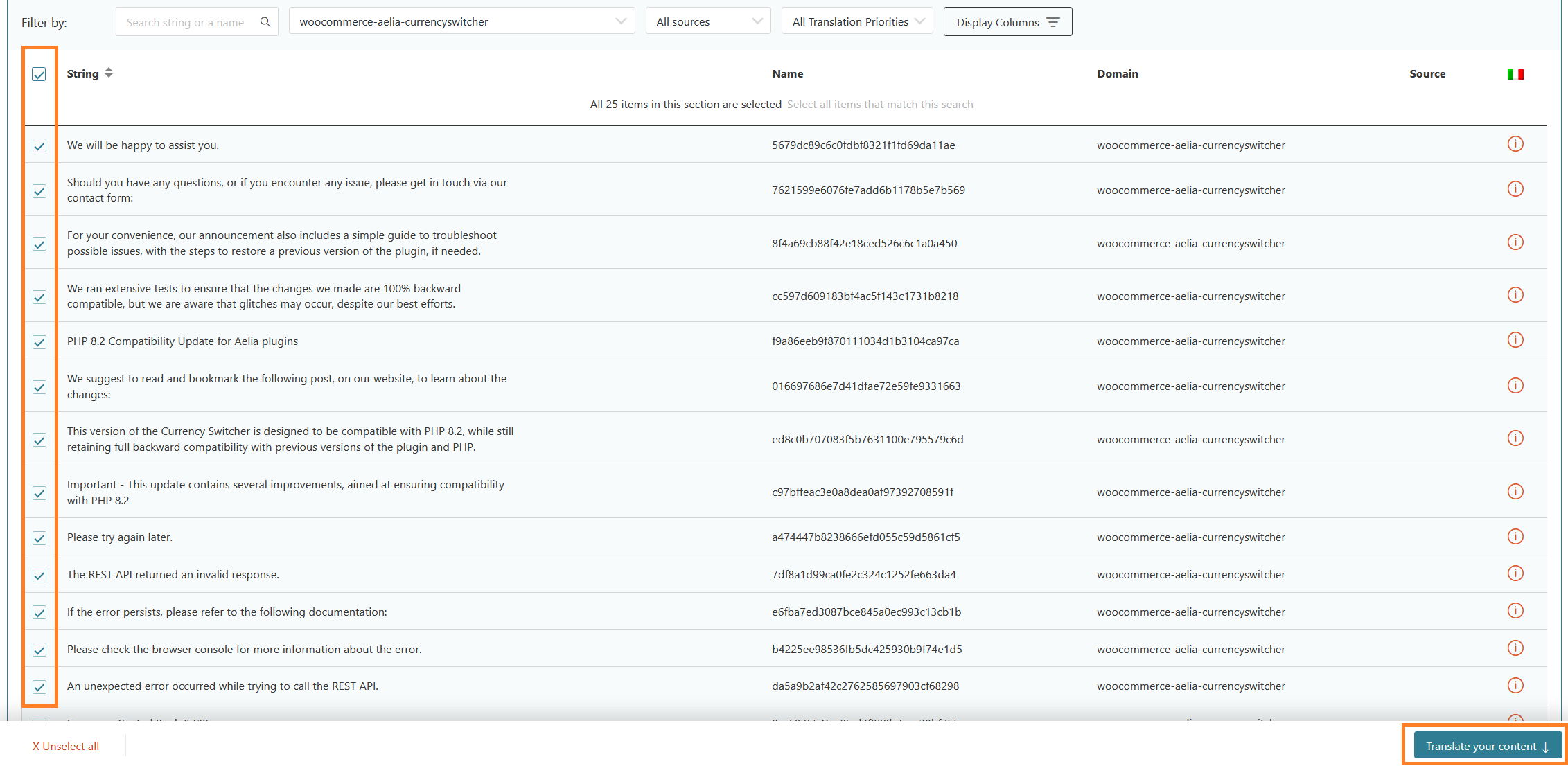 You can find all the strings that WPML registered for translation under the text-domain for the selected plugin. In the example below, the text-domain used by the plugin is "woocommerce-aelia-currencyswitcher". On that page, select the text that you wish to translate, then click on the button labelled "Translate your content".